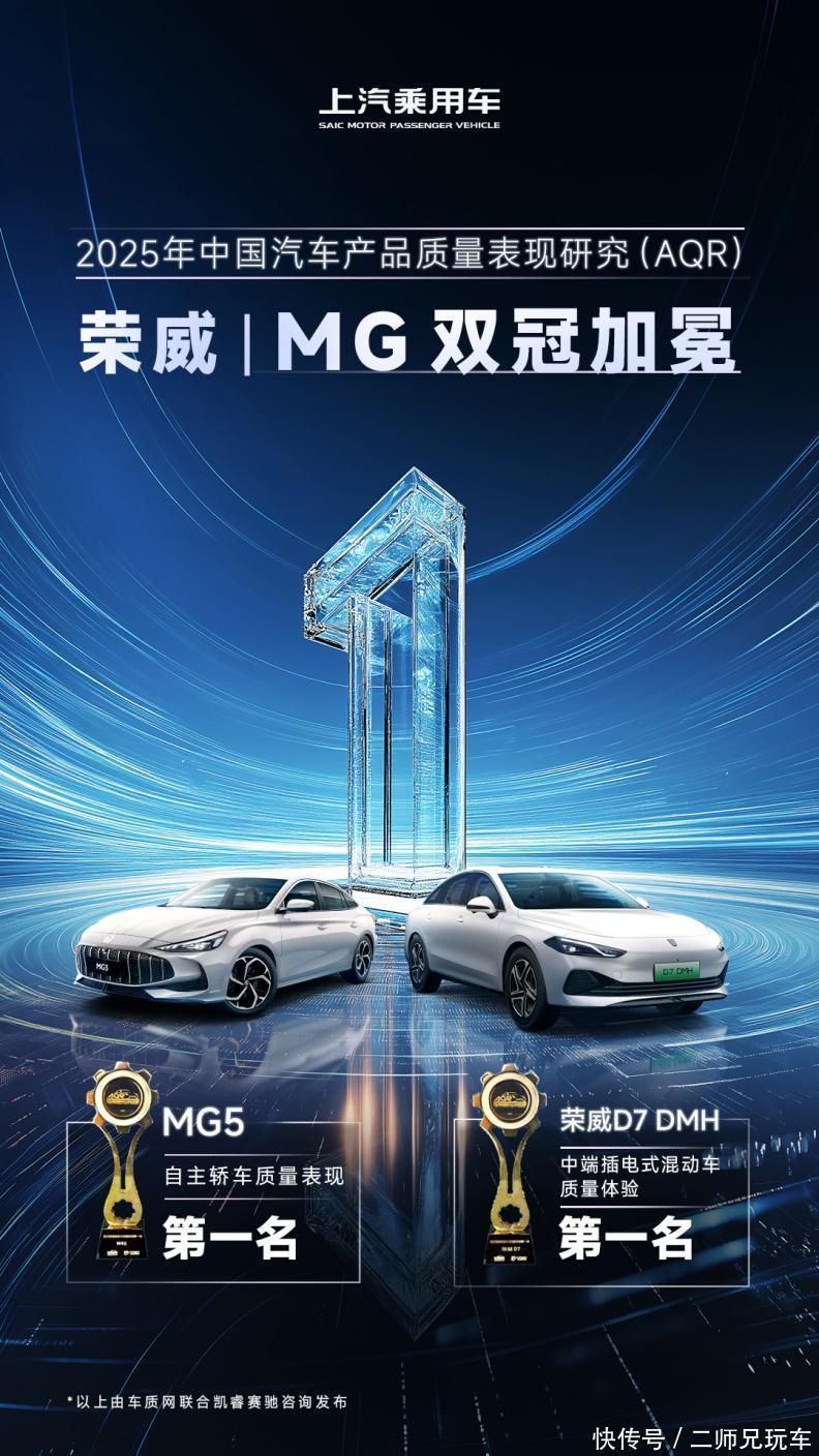 2025年9月25日,由车质网与凯睿赛驰咨询联合主办的“2025年中国汽车产品质量表现研究(AQR)结果发布暨颁奖典礼”在北京举办。上汽乘用车旗下荣威、MG两大品牌斩获双料冠军:荣威D7荣膺中端插电式混动车质量体验第一名,MG5摘得自主轿车质量表现第一名,充分彰显了上汽乘用车卓越产品实力。